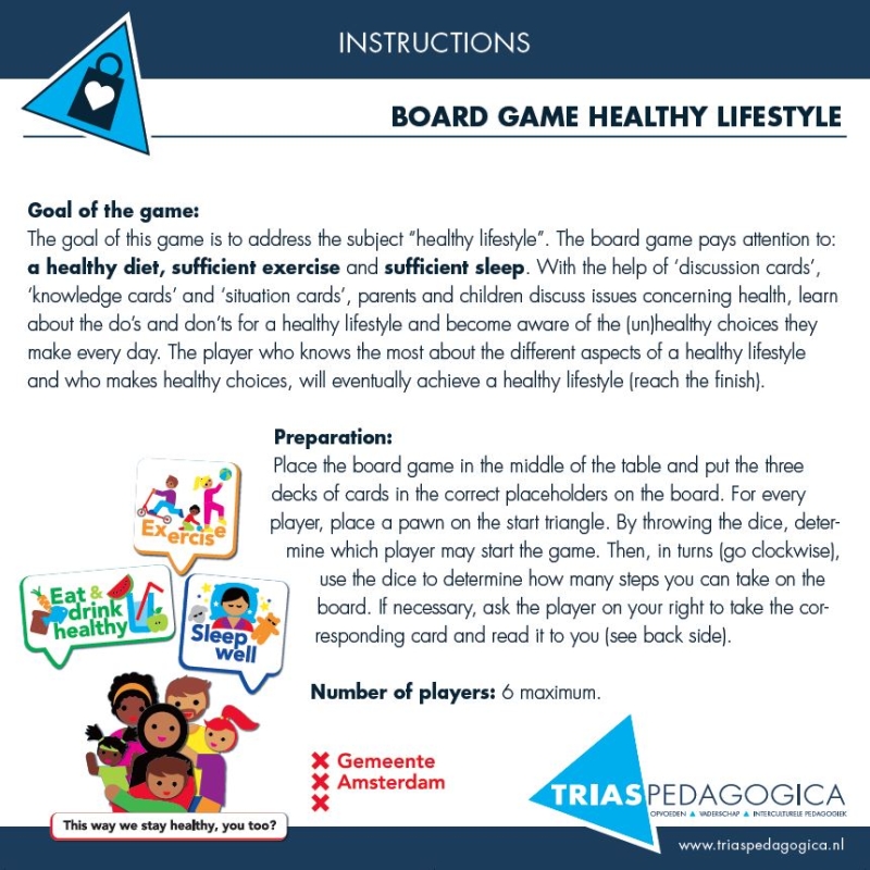 'Ieder kind heeft recht op een gezond leven.'Het bordspel ‘Een Gezonde Leefstijl' is ontwikkeld door Trias Pedagogica in opdracht van de gemeente Amsterdam vanuit de aanpak ‘Zo Blijven Wij Gezond' om een serieus onderwerp leuk en bespreekbaar te maken. In het spel staan gezonde voeding, voldoende beweging en slaap centraal.Aan de hand van kaarten in 3 categorieën - discussie, kennis en situatie - gaan ouders en kinderen met elkaar in gesprek. Over leefstijl, de do's en don'ts van gezond leven. Zo worden zij zich bewust van (on)gezonde keuzes die zij elke dag maken.Bij de ontwikkeling van het spel zijn meer dan 90 ouders en kinderen betrokken geweest.Het spel wordt vaak onder deskundige begeleiding tijdens workshops van Trias Pedagogica en het is ook zeer geschikt als educatief én leuk onderdeel van een breder evenement. Zo werd het al ingezet tijdens het speelgoedfestival, op scholen tijdens bijeenkomsten voor ouders en kinderen (bv Money School in Amsterdam Noord). Het spel is nu ook te koop voor wie het zelf wil spelen.Bekijk hier hoe kinderen dit bordspel spelen tijdens het speelgoedfestival in Amsterdam Zuidoost.Interesse in het gebruik maken van de spellen tijdens een bijeenkomst? Neem contact met ons op.